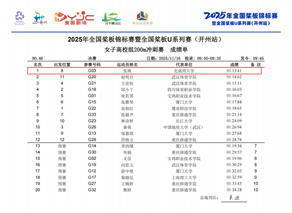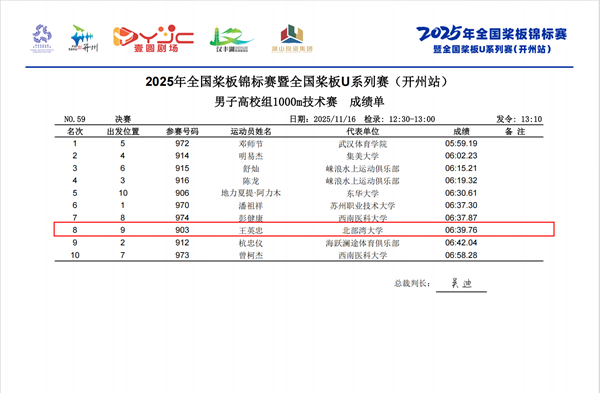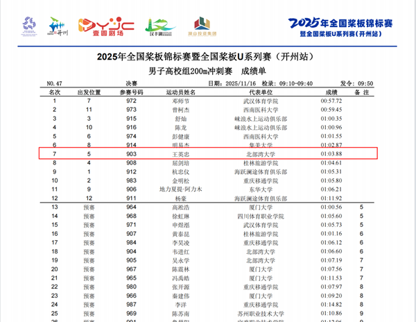 在为期两天的激烈角逐中,北部湾大学桨板队队员发挥出色,捷报频传。体教本231班张瑛同学先在极具挑战的高校组女子8000米耐力赛中勇夺季军,展现了出色的体能储备;随后在高校组女子200米冲刺赛中发挥速度优势,一举夺冠;在考验综合技巧的高校组女子1000米技巧赛中,她再次拔得头筹,最终以"双冠一季"的优异成绩成为赛场焦点。此外,体教专升本242班王英忠同学也在高校组男子200米冲刺赛和1000米技巧赛中分获第七名和第八名,显示了队伍整体实力的全面提升。