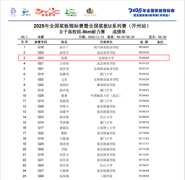2025年11月15日至16日,国内桨板运动最高级别赛事——2025年全国桨板锦标赛暨全国桨板U系列赛(开州站)在重庆开州汉丰湖盛大开幕。本次赛事汇聚了来自全国20个省市的93支队伍、1236名选手同台竞技,竞争尤为激烈。北部湾大学桨板队在教练员宁志的指导下,凭借顽强的拼搏精神和稳定的技术发挥,在强手如林的赛场上脱颖而出,斩获佳绩,为学校赢得了荣誉。