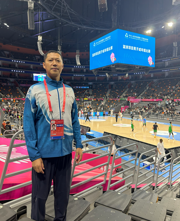 邓欣副教授,篮球国家级裁判员,现役CBA联赛裁判员(全国仅有60人,现广西唯一CBA裁判)。多次担任全国、全区篮球比赛裁判长工作。本次粤港澳全运会,担任篮球项目成年男子组技术官员。他以精准判罚与严谨态度守护赛场公平,为本次比赛搭建规范的竞技舞台。