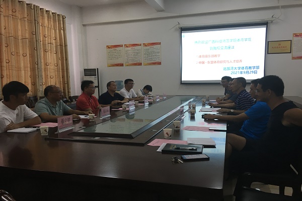 9月29日下午广西科技师范学院体育学院韦李副院长一行6人到我校考察座谈,体育教学部李乃琼主任、尹继林副主任、行政人员及相关课任教师代表陪同。