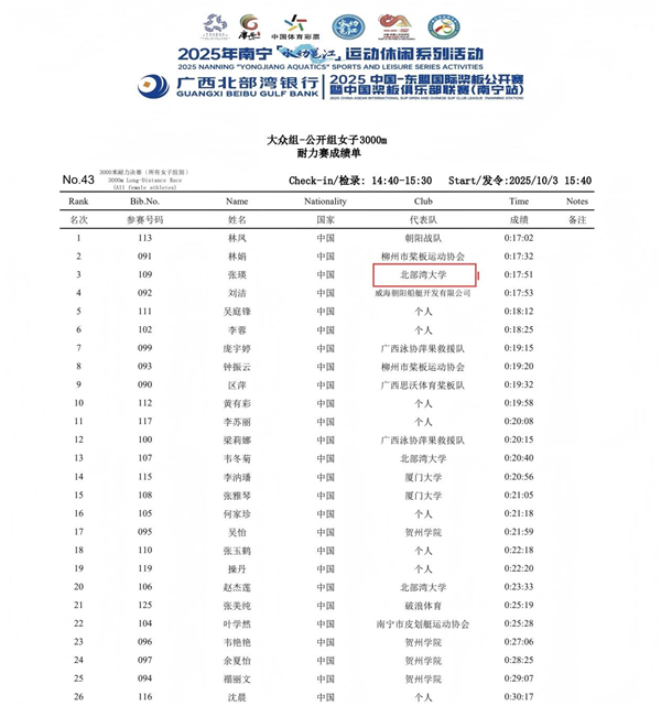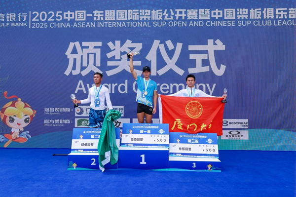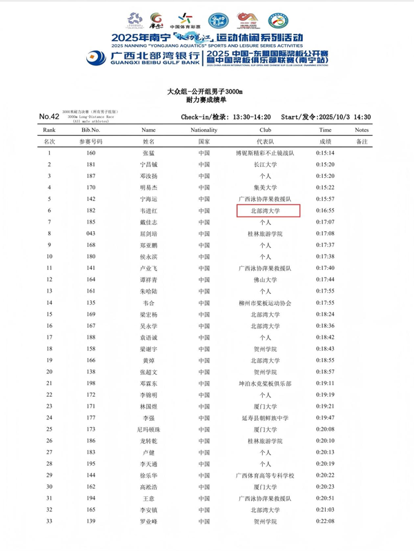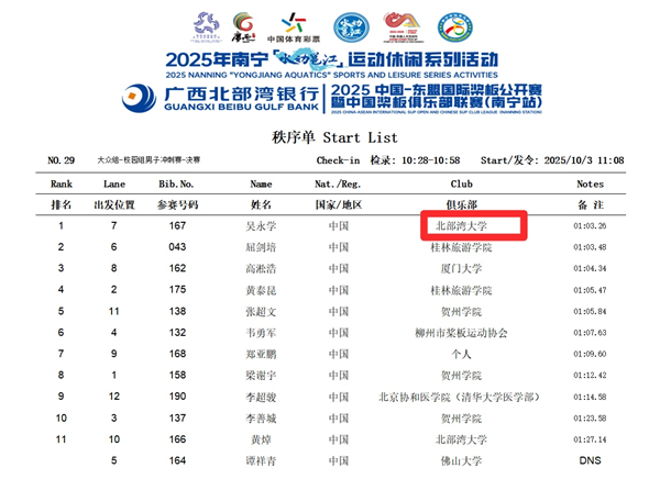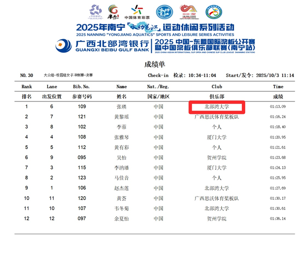 2025年10月3日,中国—东盟国际桨板公开赛暨中国桨板俱乐部联赛(南宁站)于南宁市南湖公园圆满收官。本届赛事汇聚来自泰国等东盟国家及国内多支队伍,共约700名选手参与角逐。在领队唐明欢、主教练宁志的带领下,北部湾大学桨板队战绩出色,在多个组别斩获优异战绩,展现出湾大学生顽强拼搏、昂扬向上的体育风貌。