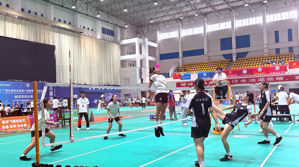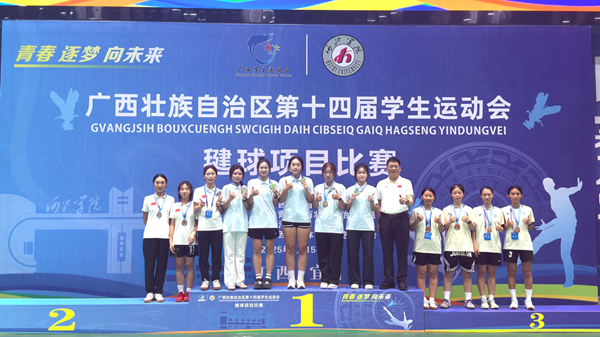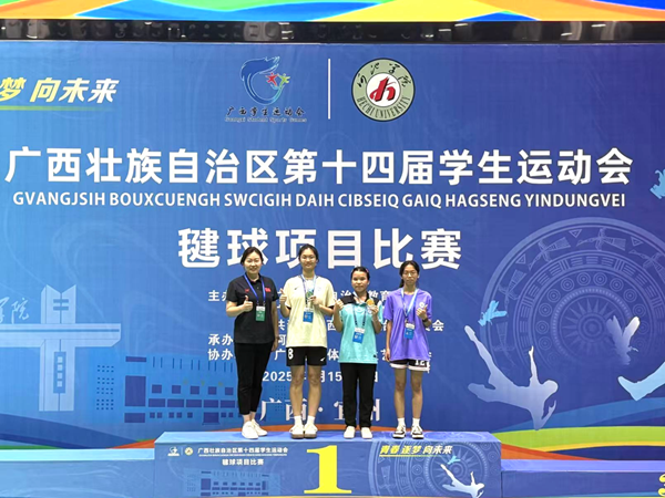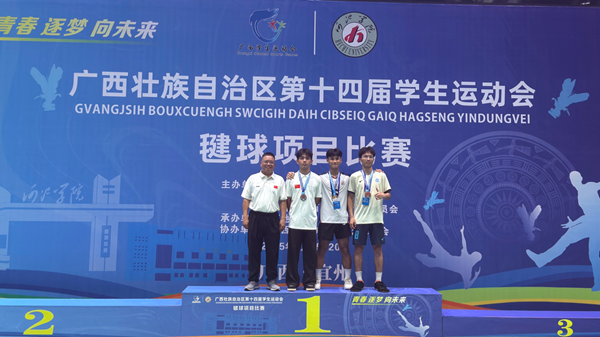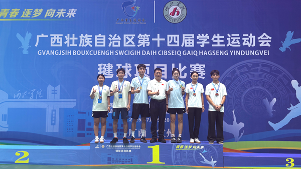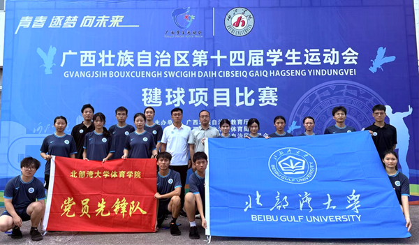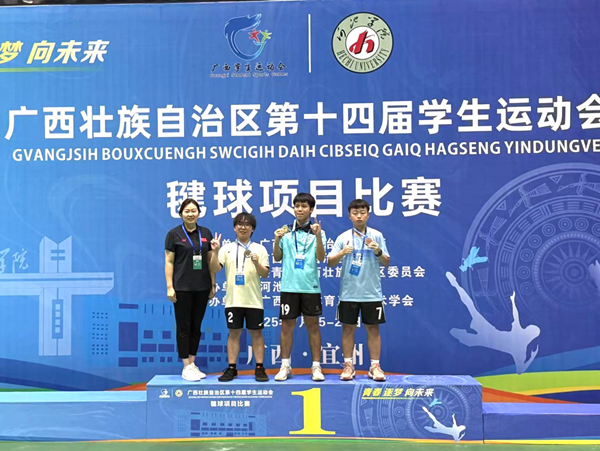 2025 年 7月15 日至 20 日,广西壮族自治区第十四届学生运动会毽球比赛在河池学院体育馆顺利举行。北部湾大学代表队由秦尉富担任领队,房鹏飞、刘晨皓、韩沅成担任教练员。凭借扎实的毽球技术和顽强的拼搏精神,毽球队交出了一份亮眼的成绩单,为学校赢得了荣誉。