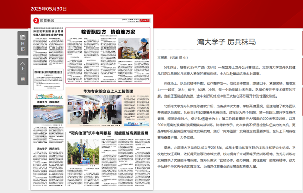 作为赛场新锐,北部湾大学龙舟队凭借其青春洋溢的风貌和顽强拼搏的精神,成为赛事焦点,吸引了众多观众和媒体的关注。钦州市广播电视台《新闻9点半》栏目以“端午节东盟留学生龙舟赛训练体验”为主题,深入报道了队伍的日常训练实况。《钦州日报》亦刊发专题报道“北部湾大学学子备战龙舟赛 青春力量劈波斩浪展风采”,专访了龙舟队教练及队员,生动展现了队伍积极昂扬的备战姿态,引发了良好的社会反响。