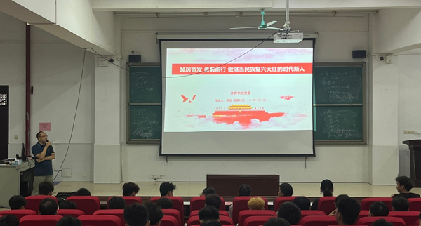 2024年9月25日晚,体育学院在12号教学楼104报告厅开展以“踔厉奋发,勇毅前行,做堪当民族复兴大任的时代新人”为主题的2024级新生思政第一课及入党启蒙教育活动。此次活动由学院党委副书记漆刚主讲,2024级全体新生参加。